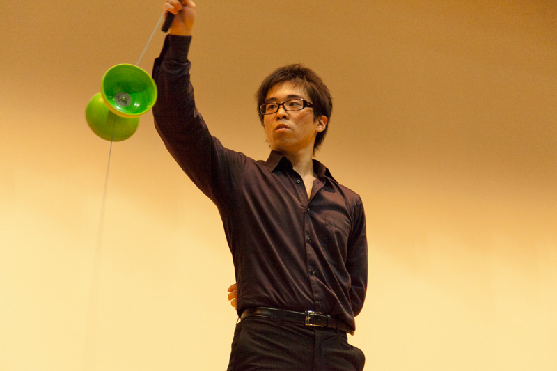 歓迎パーティでは、本学に顕著な功績等を残された卒業生表彰者並びに名誉フェロー授与者のご紹介、谷口学長から本学の近況報告の後、歓迎の意と学生の活動を紹介することを目的に、ジャグリング、舞踏研究部、邦楽部、チアリーディング部、応援団の演舞を披露しました。
