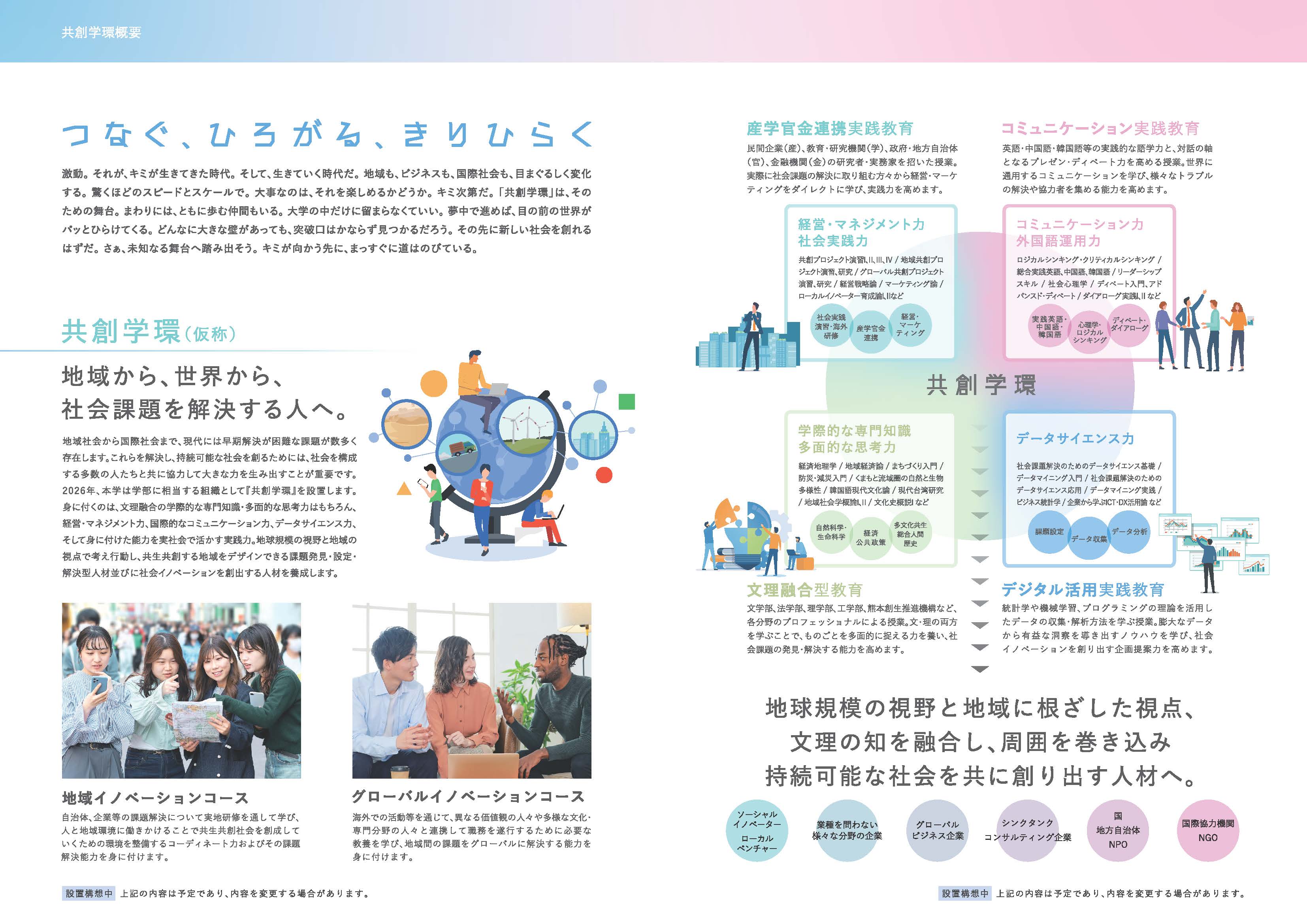 令和6年7月30日、熊本大学は、学生が所属する新しい学部組織(学士課程)として、地球規模の視野と地域の視点で考え行動し、共生共創する地域をデザインできる課題解決発見?設定?解決型人材並びに社会イノベーションを創出する人材を育成する学部等連係課程「共創学環(仮称)」を、令和8年度に設置する構想を発表しました。