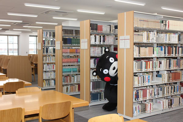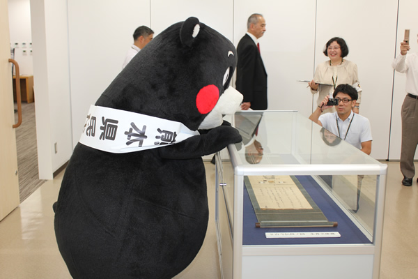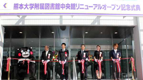 続いて、図書館職員から利用者代表への記念品贈呈、利用者代表から大学関係者への花束贈呈、関係者によるテープカットが行われ、記念品贈呈からは、熊本県民を代表してくまモンも駆けつけ、みごとな(?)パフォーマンスを披露しました。